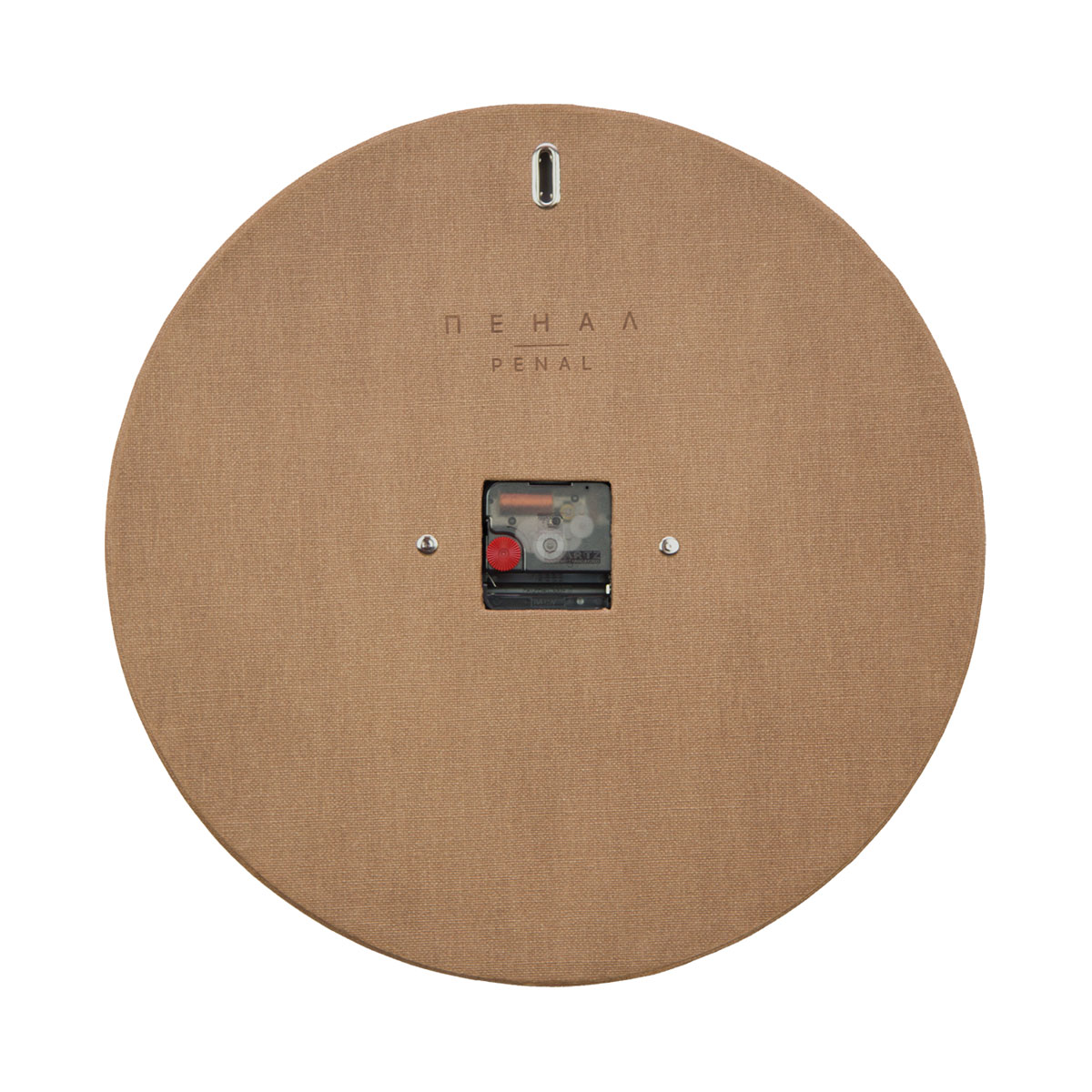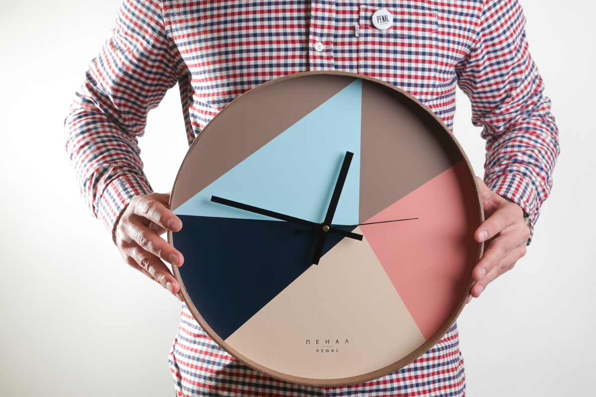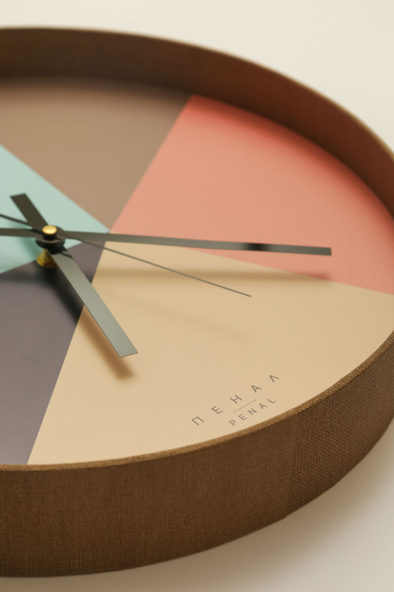 The Cozy Living Wall Clock by PENAL features original geometric prints on high-quality materials. This particular timepiece features a beautiful face with pastel-colored geometric shapes in a natural brown custom made cardboard frame. These colors will fit perfectly with most home or office spaces. These colors fit best with wooden furniture, leather or other pastel or natural-colored room décor.